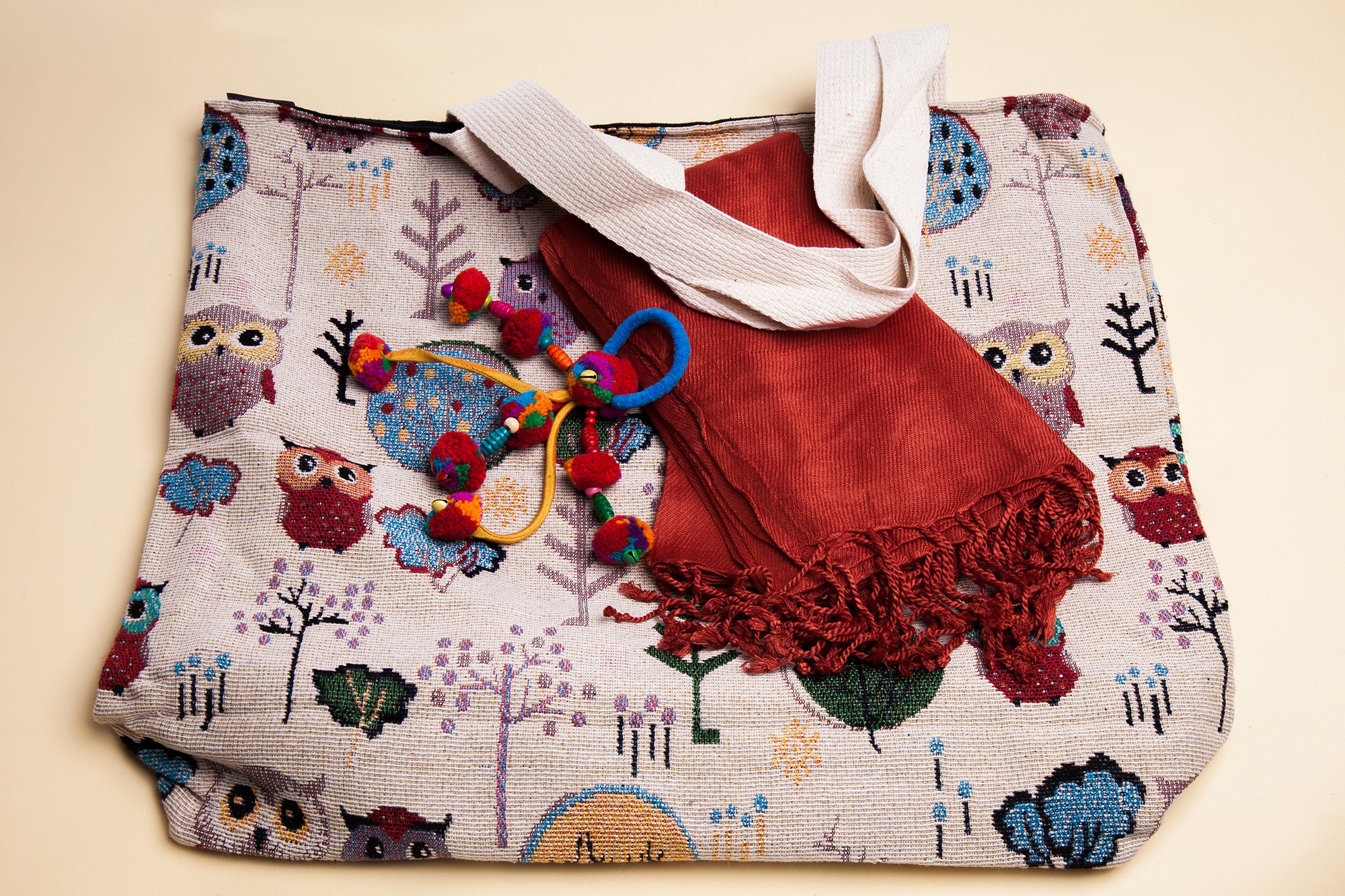 - geanta gri de mana din bumbac cu bufnite,care are urmatoarele dimensiuni: 45cm x 42cm